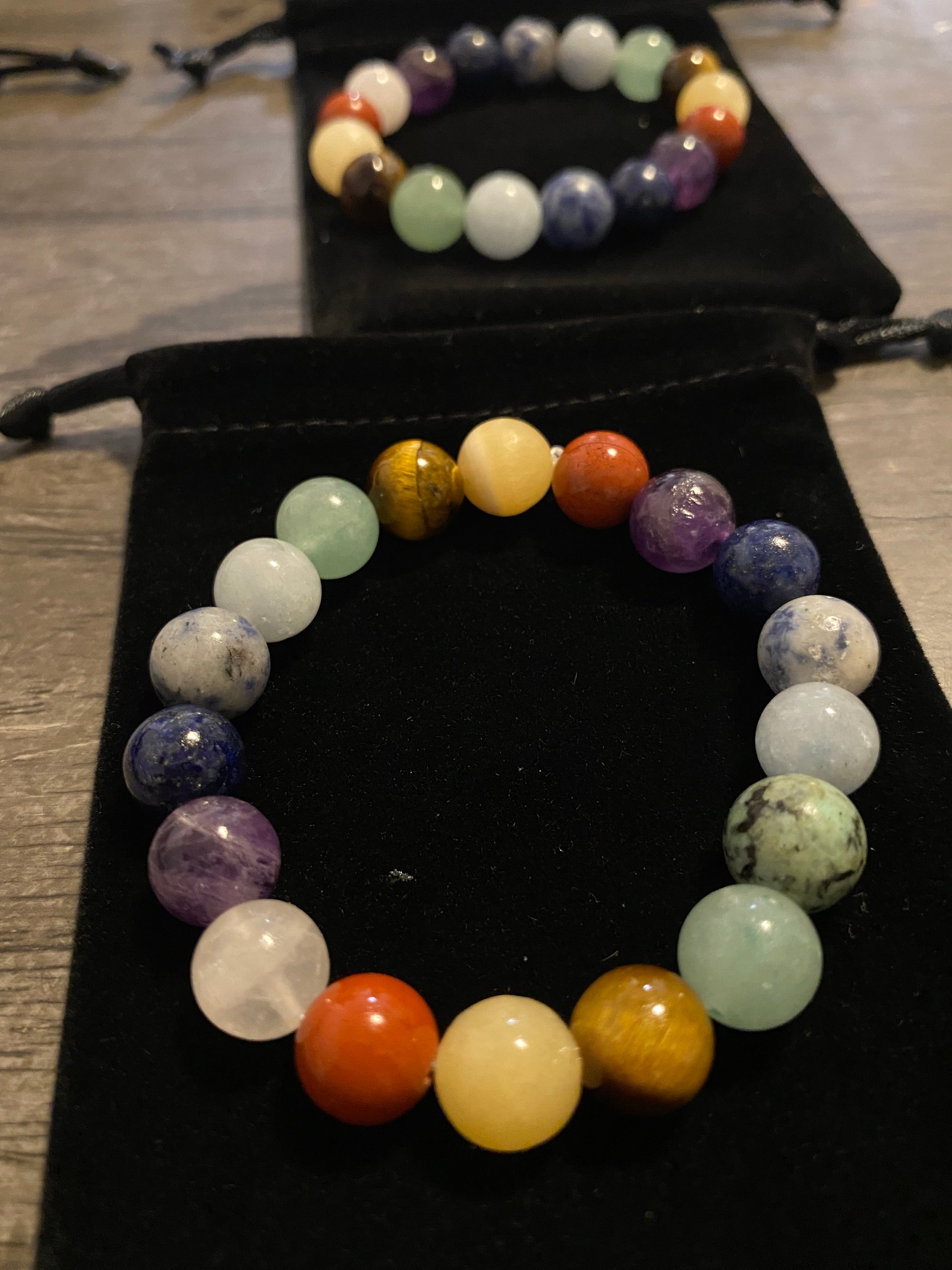 Each bracelet includes a traditional 7 chakra color sequence using natural gemstones selected for their distinctive colors and symbolic meanings: